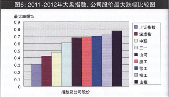 2011年,行業(yè)遭遇寒冬,三駕馬車營業(yè)收入合計增三率與宏觀經(jīng)濟指標對比,呈加速度下跌態(tài)勢,而且在資本市場的表現(xiàn)弱于滬深大盤指數(shù)。2011年~2012年間,其股價從最高點至最低點,下跌47.3%、61.2%、69.8%不等;而同期上證指數(shù)下跌幅度只有30.67%,深成指下跌42.1%。盡管與行業(yè)內(nèi)其他上市公司同期資本市場表現(xiàn)相比,工程機械行業(yè)三駕馬車的表現(xiàn)仍有亮點,但其同期跌幅大于上證和深成指跌幅,仍然令公司形象受損,影響資本市場再融資能力。因此,打造公司核心競爭力,提升公司投資價值,提振資本市場投資者信心,至關重要(大盤指數(shù)、公司股價最大跌幅比較圖,見圖6)。