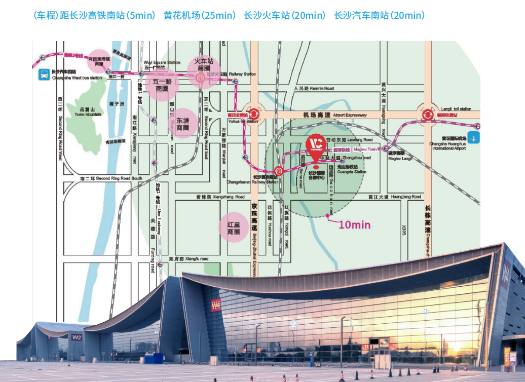 乘坐2號(hào)線或4號(hào)線抵達(dá)光達(dá)站,步行400米達(dá)到長沙國際會(huì)展中心