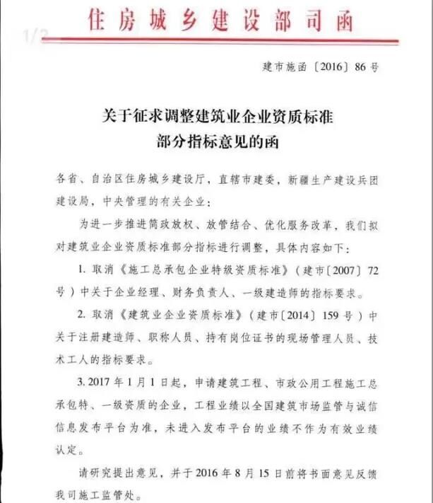 近日,住房和城鄉(xiāng)建設(shè)部建筑市場監(jiān)管司就“調(diào)整建筑業(yè)企業(yè)資質(zhì)標(biāo)準(zhǔn)部分指標(biāo)”征求意見(建市施函[201686號),主要內(nèi)容有以下兩點(diǎn):